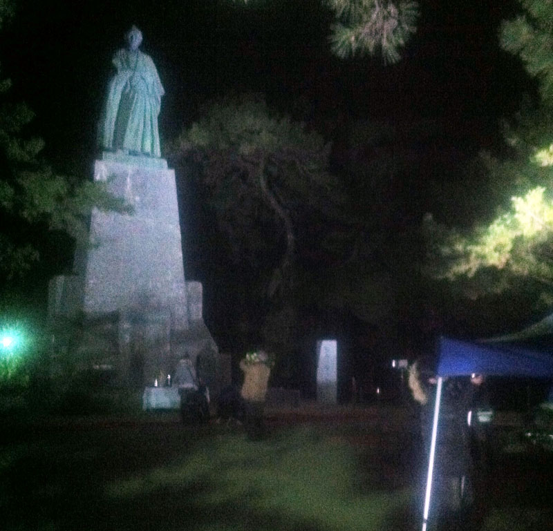 ▲真っ暗な龍馬像前で黙々と作業するスタッフ一同。